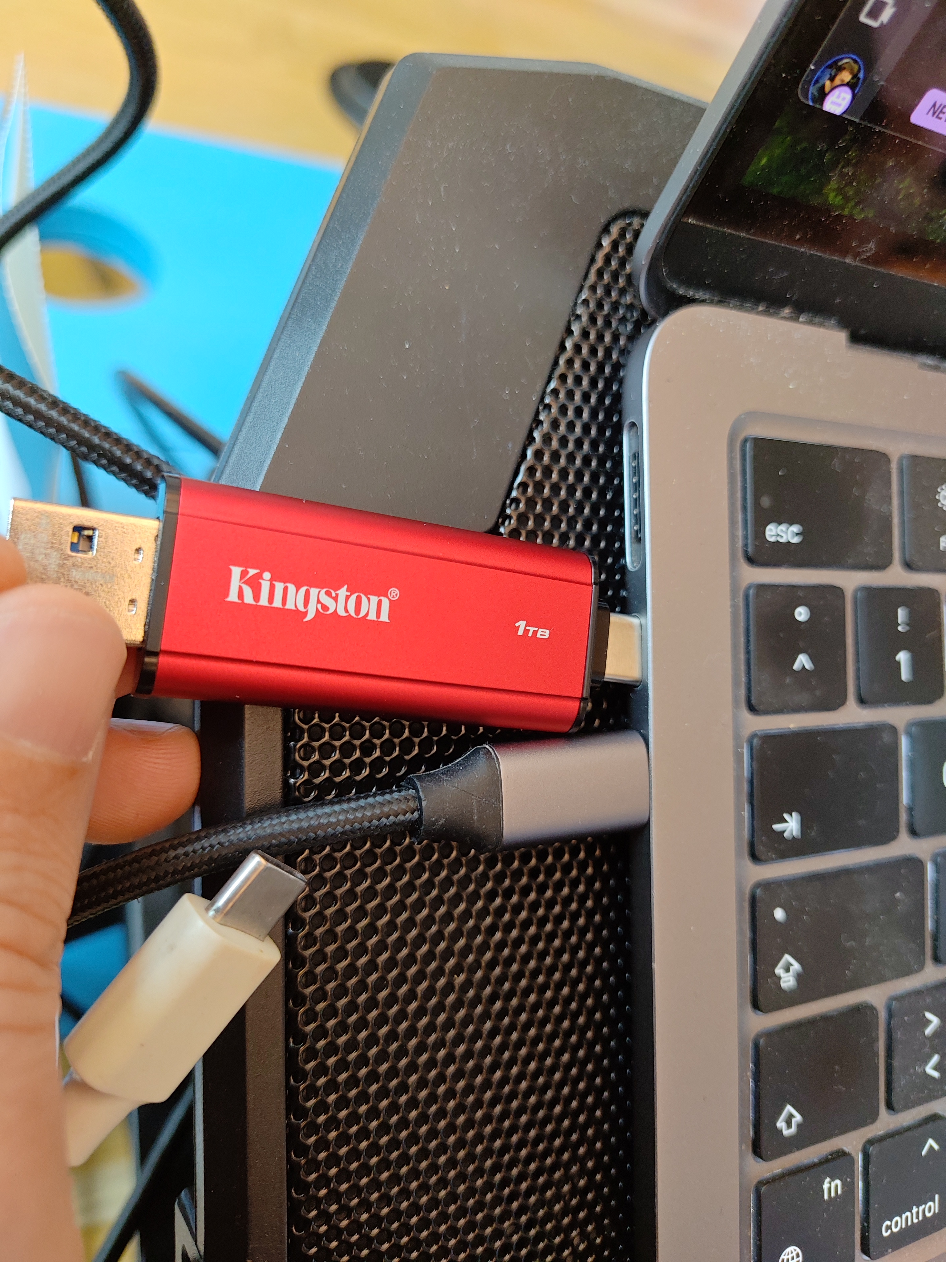 Malgré sa compacité globale, l'épaisseur du Kingston Dual (1,09 cm) combinée à la largeur de son boîtier peut bloquer l'accès aux ports adjacents sur des hubs USB serrés ou sur certains ordinateurs portables dotés de connecteurs rapprochés. Ce phénomène se manifeste surtout en position USB-A, où le format perpendiculaire au port occupe davantage d'espace latéral qu'une clé USB traditionnelle fine. Sur un MacBook Pro équipé de deux ports USB-C côte à côte, brancher le SSD peut empêcher l'utilisation simultanée de l'emplacement voisin si celui-ci accueille déjà un accessoire volumineux.