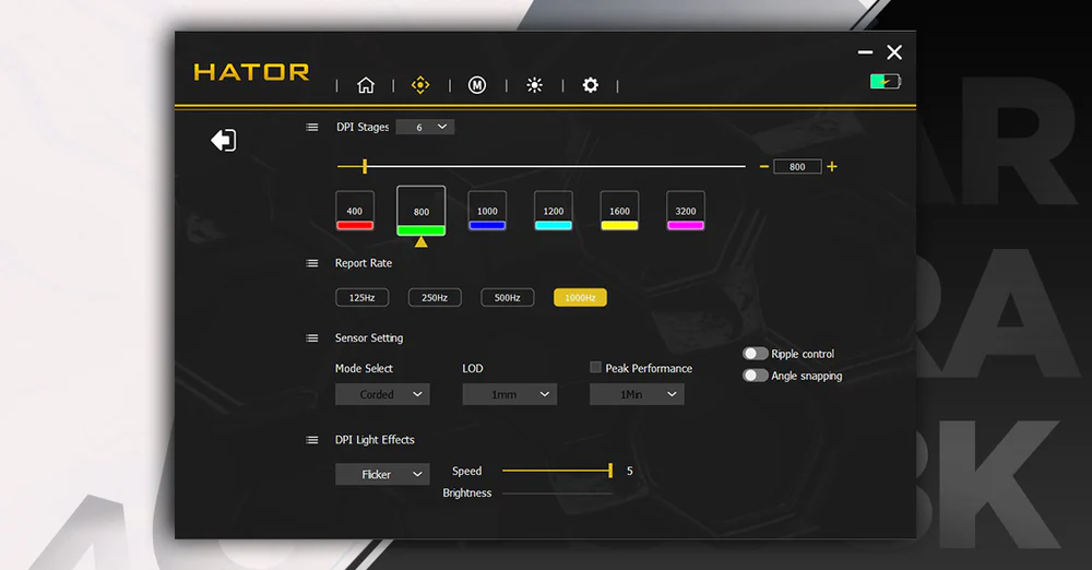 Le logiciel HATOR MouseHUB donne accès à l'ensemble des réglages nécessaires sans tomber dans la surcharge d'options inutiles. L'interface permet de configurer cinq paliers de DPI avec code couleur LED pour identification visuelle, d'ajuster le polling rate entre 125 Hz et 8 000 Hz, d'attribuer des fonctions aux six boutons programmables, et de gérer l'éclairage RGB de la zone du logo.